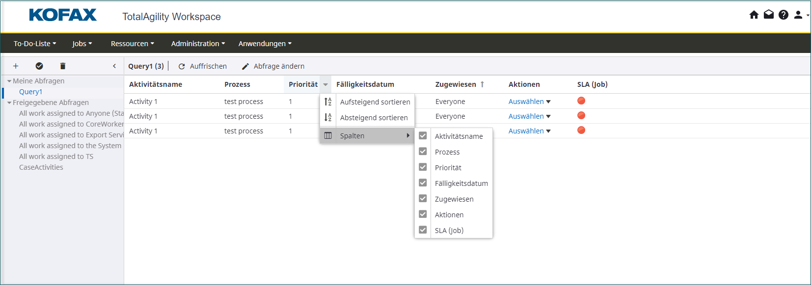 Sie können Spalten aufsteigend oder absteigend sortieren und Spalten ein- oder ausblenden.