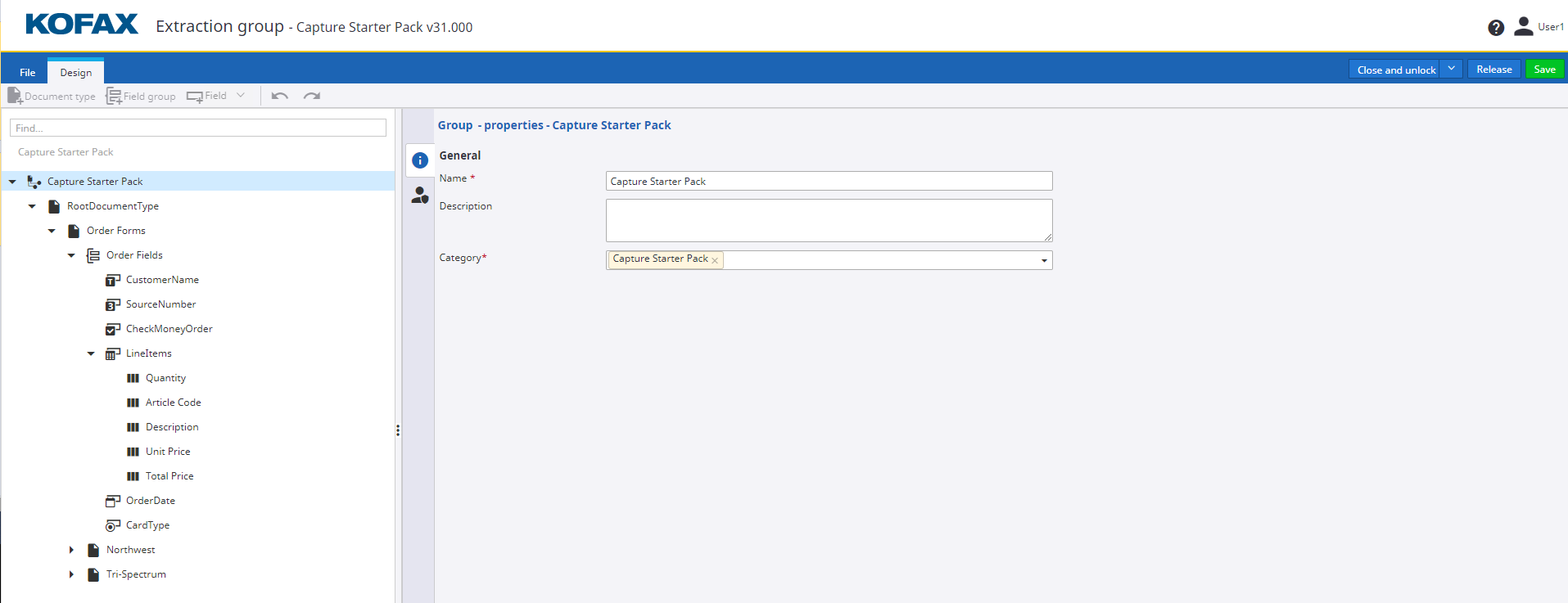 To open the Capture Starter Pack extraction group, navigate to Capture, and click Extraction groups. On the Extraction groups page, on the Category list, select Capture Starter Pack. The Capture Starter Pack extraction group is displayed in the list. Click the Capture Starter Pack. The extraction group opens in a new browser tab. Expand the Order Forms document type to view the other document types. You can also search for the required document type name.
