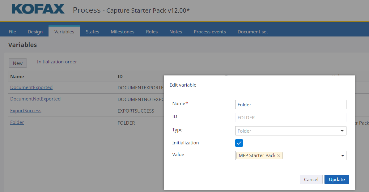 A folder is assigned to the process variables and initialized when a new job is created. To use a different folder type, replace the folder variable with a different folder.