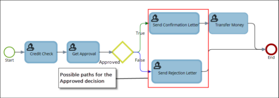 For example, in the Loan Approval map, the Send Confirmation Letter and Send Rejection Letter are two possible paths for the Approved decision. If the APPROVED condition evaluates to TRUE, the Send Confirmation Letter activity takes place at which point the confirmation letter is sent to the customer, and the money is transferred to the customer's credit account. Otherwise, the Send Rejection Letter activity takes place, at which point the rejection letter is sent to the customer.