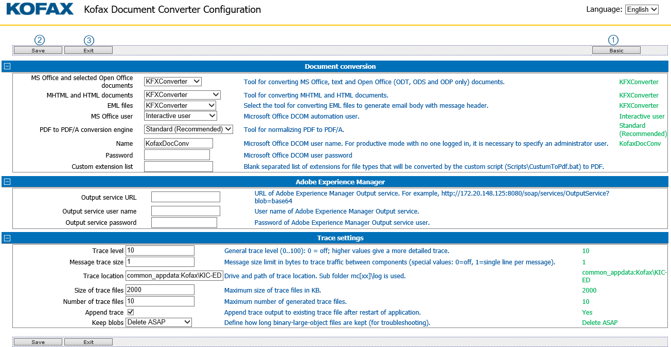 Toggle between Advanced and Basic buttons to display or hide advanced configuration settings. Note In an Azure environment, the document conversion only uses the default configuration settings; you cannot