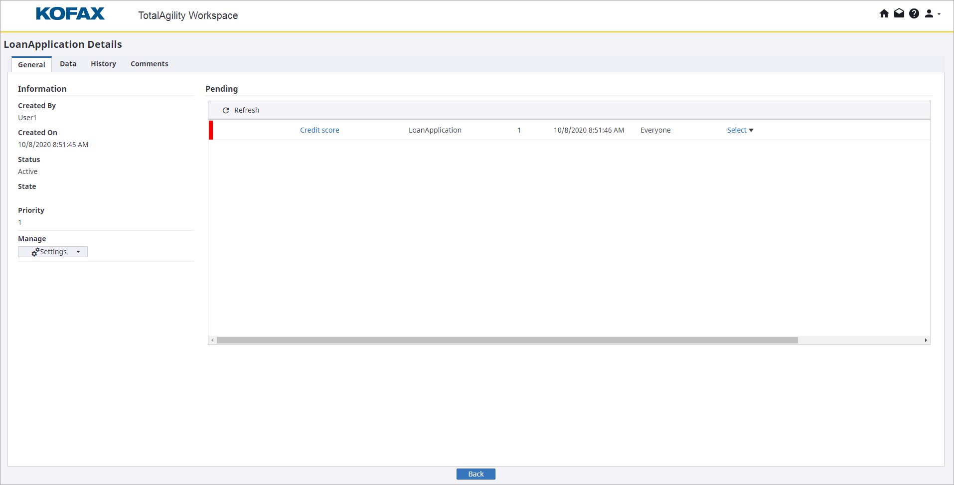 General: This tab includes general information such as the creator of the application, the time and date of creation, service level, status, state and priority and the activities that are open. You can perform actions such as take activities, view job properties and add notes to the activities.