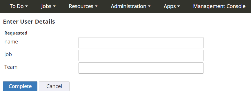 Enter values for name (example: XYZUser), job (example: Management) and Team (example: ABC) and click