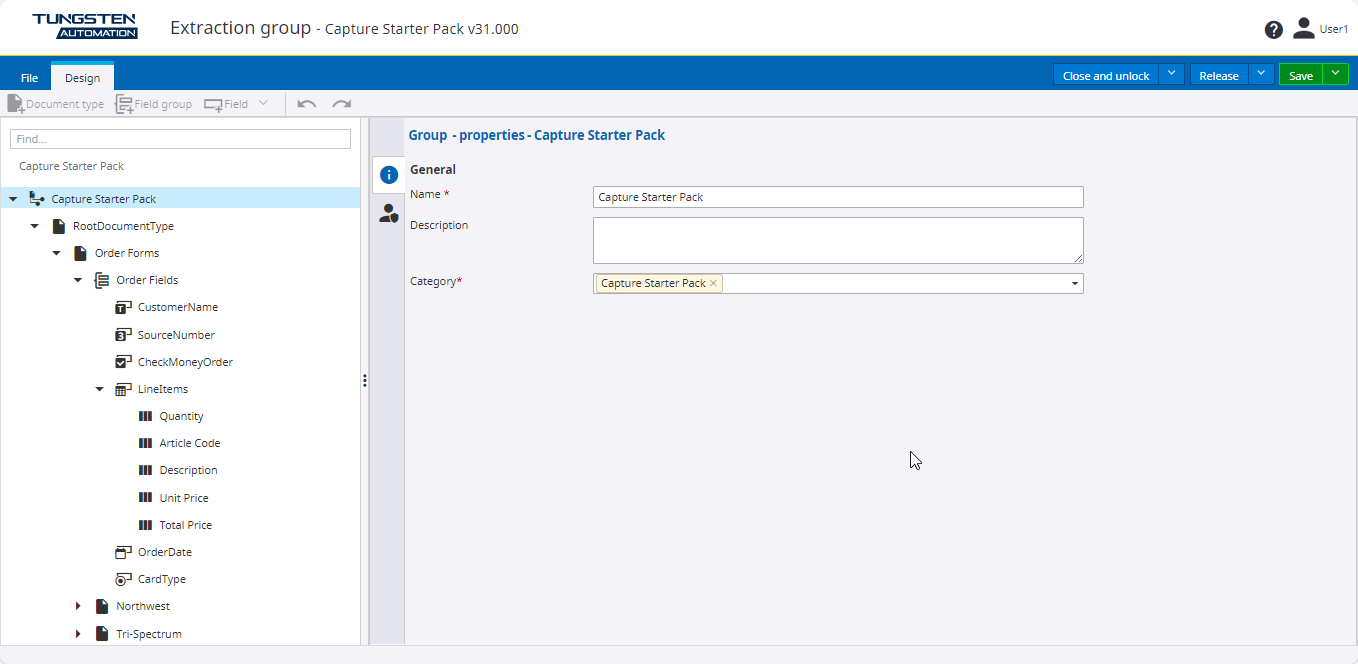 To open the Capture Starter Pack extraction group, navigate to Capture, and click Extraction groups. On the Extraction groups page, on the Category list, select Capture Starter Pack. The Capture Starter Pack extraction group is displayed in the list. Click the Capture Starter Pack. The extraction group opens in a new browser tab. Expand the Order Forms document type to view the other document types. You can also search for the required document type name.