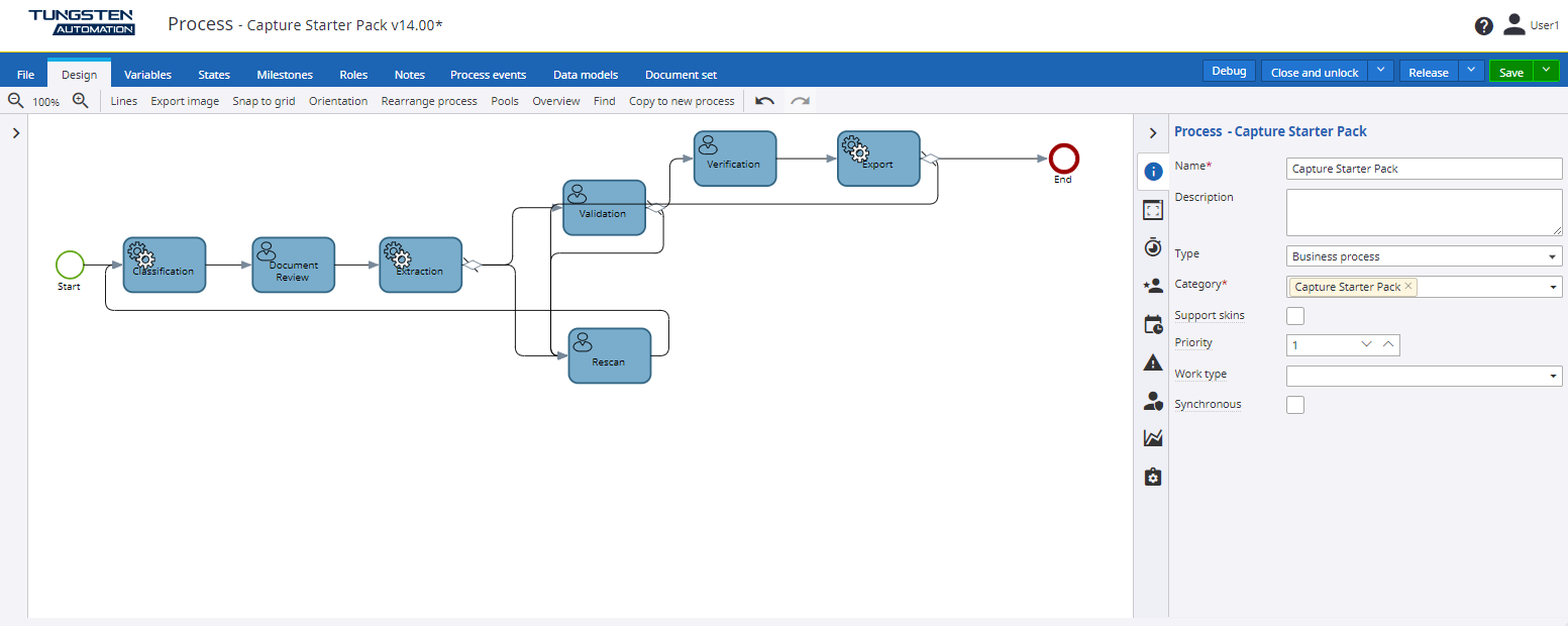 To open the Capture Starter Pack process, Navigate to Workflow, and click Business processes. On the Business processes page, on the Category list, select Capture Starter Pack. Click the Capture Starter Pack business process. The process opens in a new browser tab.
