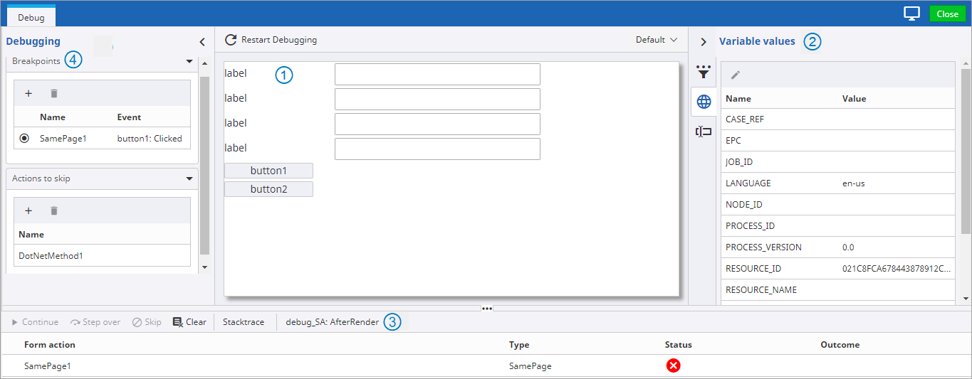 When you reach a breakpoint, you can expand any server side action, such as .Net action and view and update the values of controls, form and global variables and continue execution.