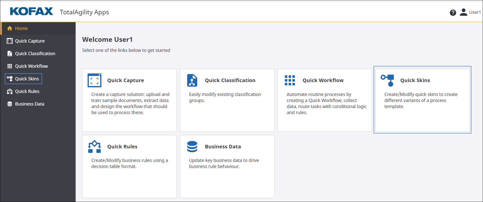 When you install Kofax TotalAgility, Quick Skins is automatically installed and available under TotalAgility Apps. Ensure you have access for the following to use the Quick Skins application: