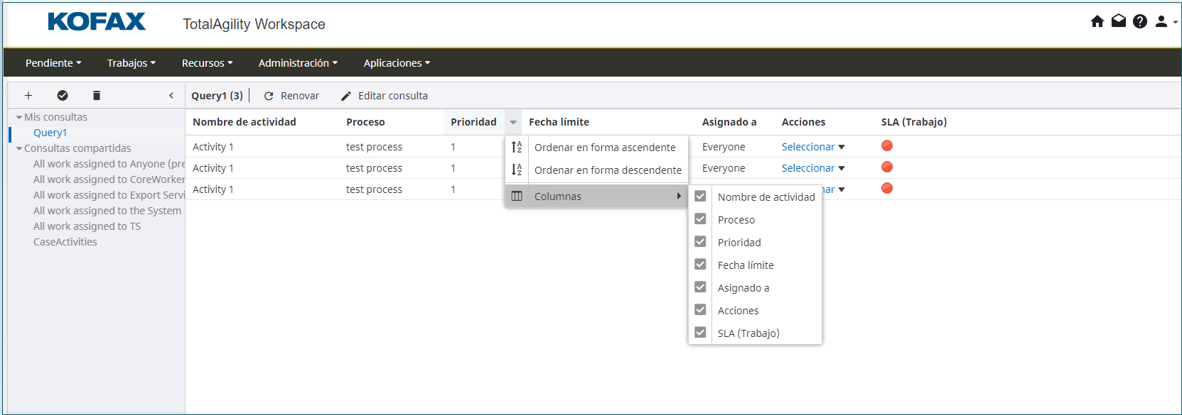 Puede ordenar las columnas en orden ascendente o descendente, así como ocultarlas o mostrarlas.