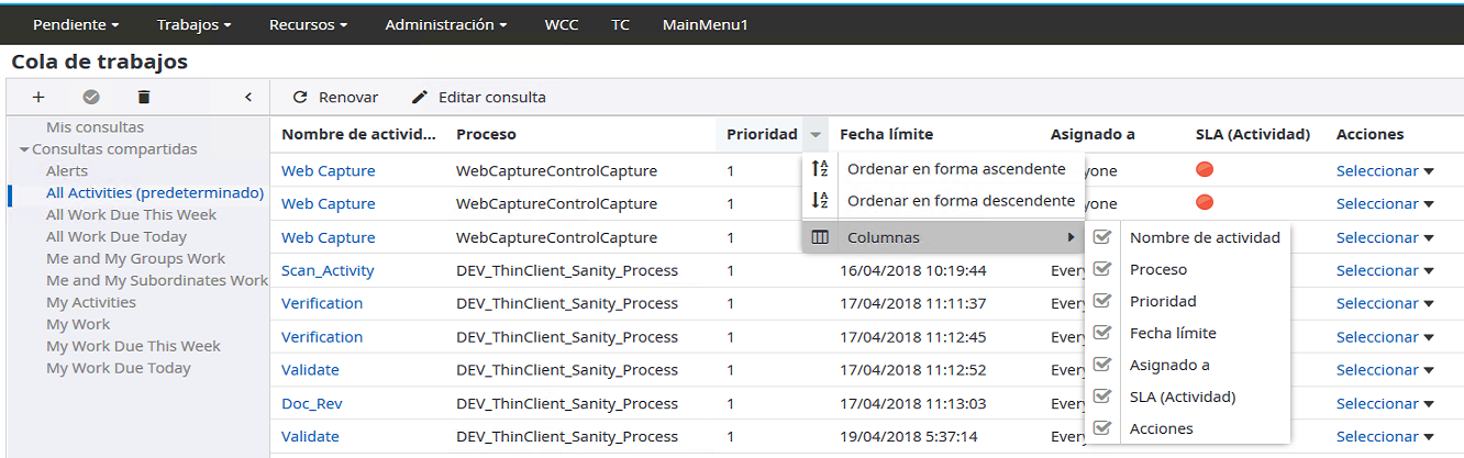 3. Para ocultar columnas, en el menú de columna, como Nombre de actividad, ponga el cursor sobre Columnas y quite la marca del recuadro, para ocultar la columna.