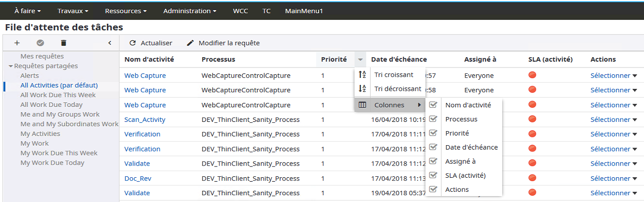 3. Pour masquer des colonnes, par exemple Nom d'activité, pointez la souris sur Colonnes dans le menu Colonne et décochez la case de chaque colonne à masquer.