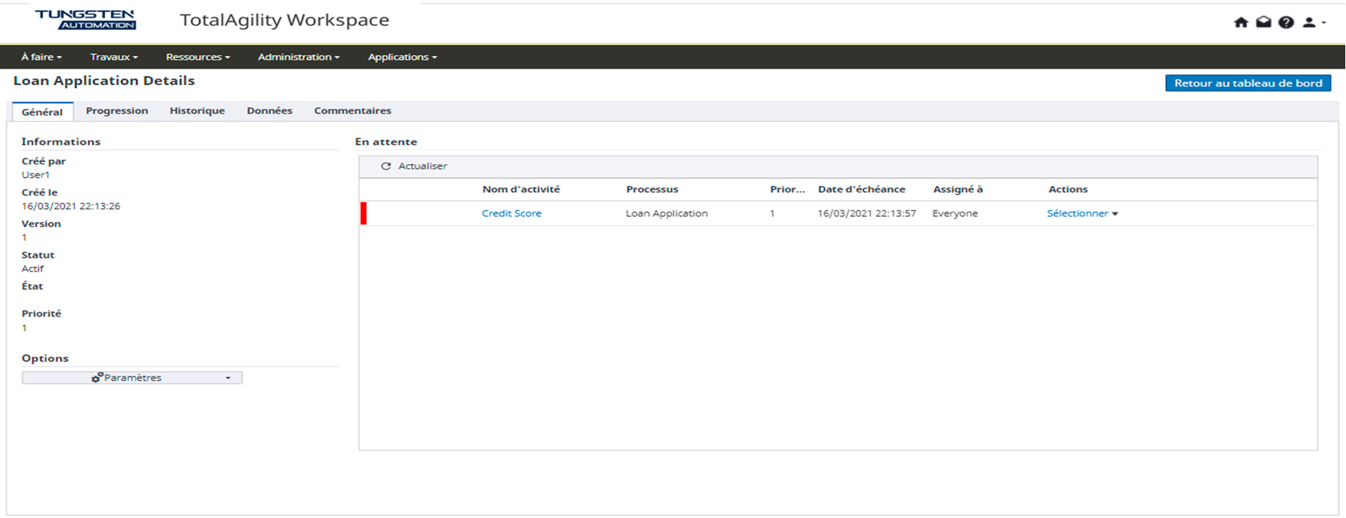 Travaux : Cette option vous permet d'effectuer diverses actions telles que l'affichage des travaux, l'arrêt des travaux, l'ajout de remarques ou la modification des états. Pour afficher les propriétés du travail, cliquez sur le lien de l'application sous Processus, qui vous redirige vers le formulaire des détails du travail qui comprend les onglets suivants :