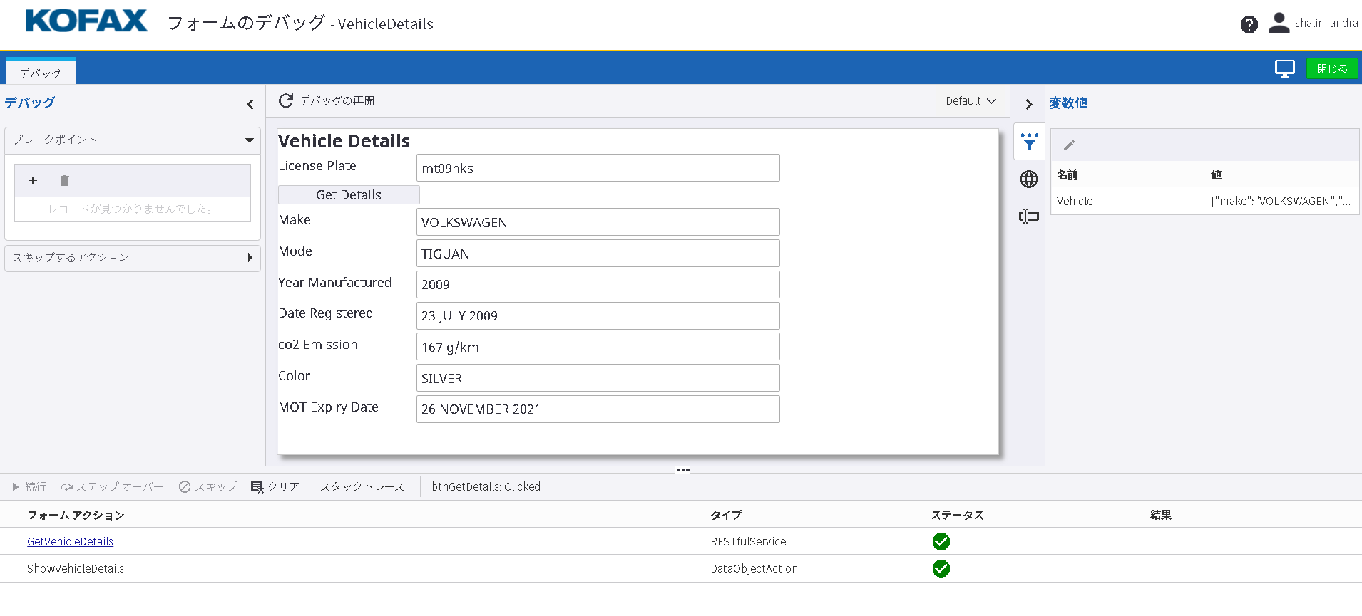 この手順では、フォームをテストして、[VehicleDetails] フォームと [Vehicle] データ オブジェクト フォーム変数のすべてのフィールドにデータが入力されていることを確認します。