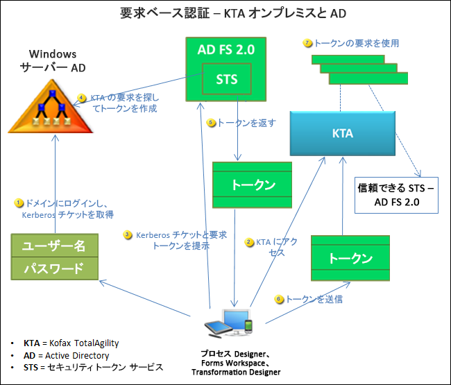 このシナリオでは、ローカルの Windows サーバー AD FS 2.0 を ID プロバイダとして使用する TotalAgility オンプレミスについて説明します。