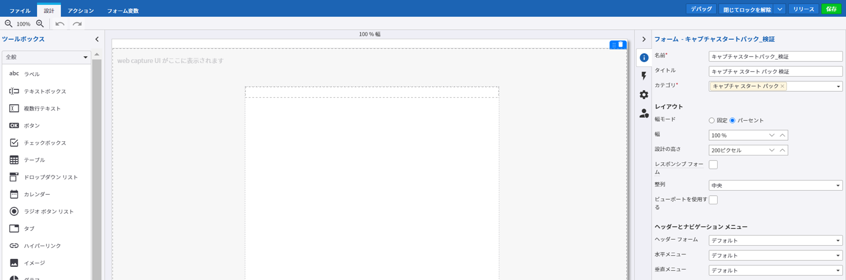 フォームを開くには、[ユーザー インターフェイス] に移動し、[フォーム] をクリックします。[フォーム] ページの [カテゴリ] リストで、[キャプチャ スタート パック] を選択します。キャプチャ スタート パックには、次のフォームが含まれています。