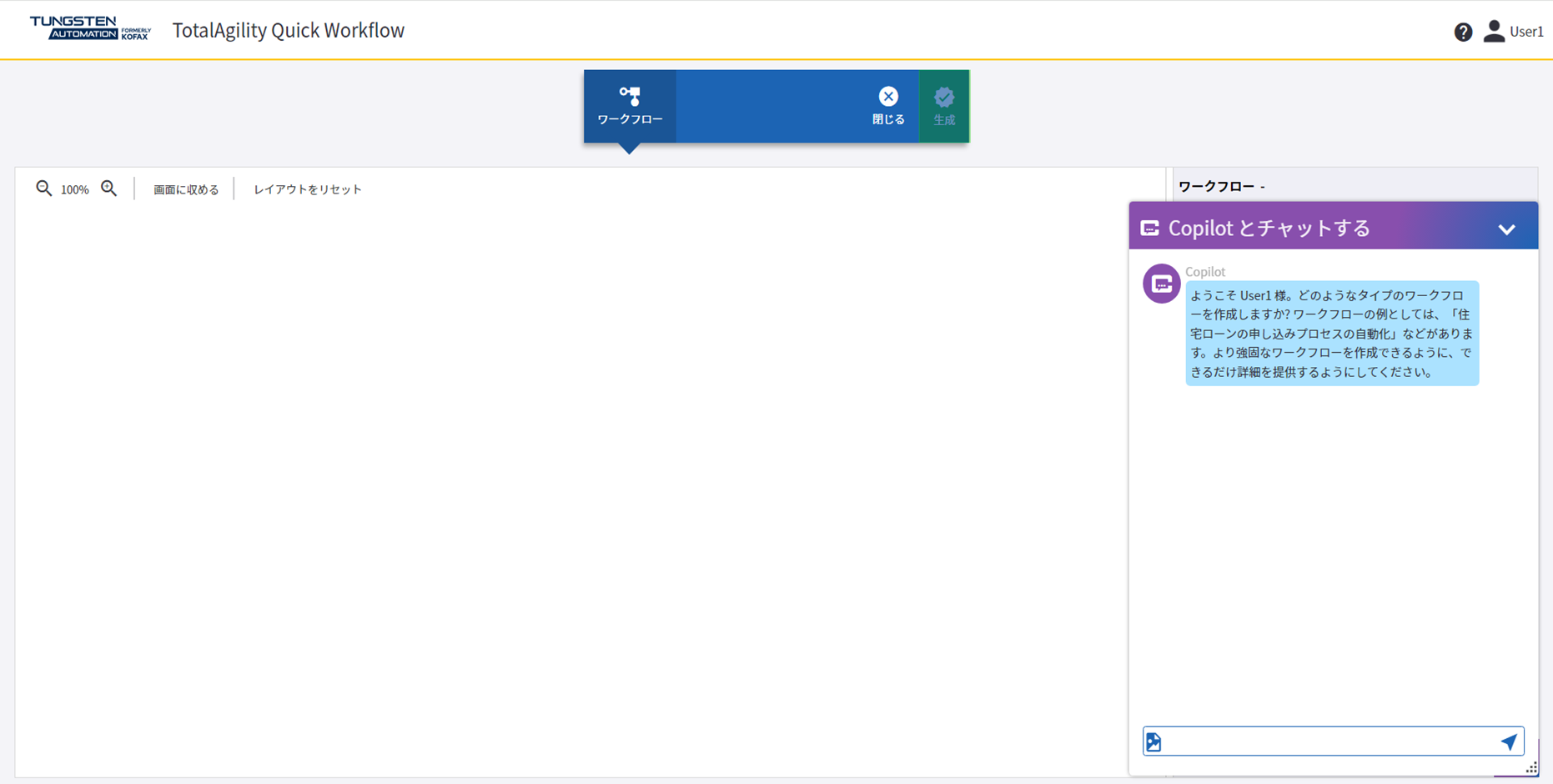 Kofax TotalAgility Quick Workflow デザイナーが開き、[Copilot とチャットする] フローティング ウィンドウが表示されます。ここで Copilot とチャットし、ワークフローの作成をリクエストできます。
