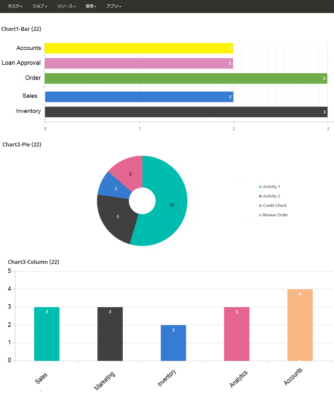 グラフ 1 - 横棒グラフ: このグラフは、ライブ ジョブの数とそのジョブ プロセスの名前を表しています。このケースでは、在庫プロセスに 3 個のライブ ジョブが関連付けられており、販売には 2 個のジョブ、注文には 3 個のジョブ、ローン承認には 2 個のジョブがあり、アカウント プロセスには 2 個のライブ ジョブが関連付けられています。