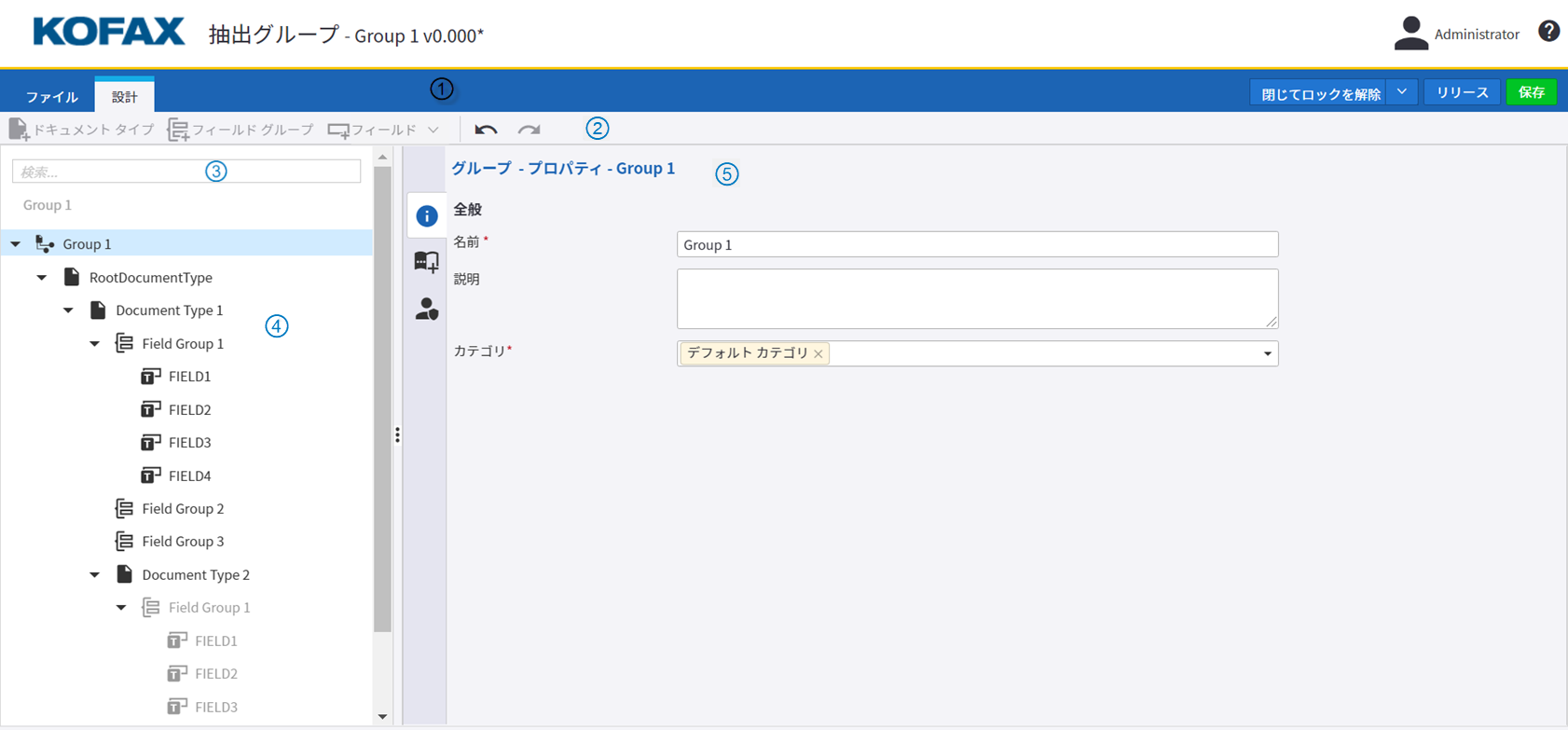 抽出グループ ツリー内で、特定のドキュメント タイプ、フィールド グループ、フィールドを検索できます。 |