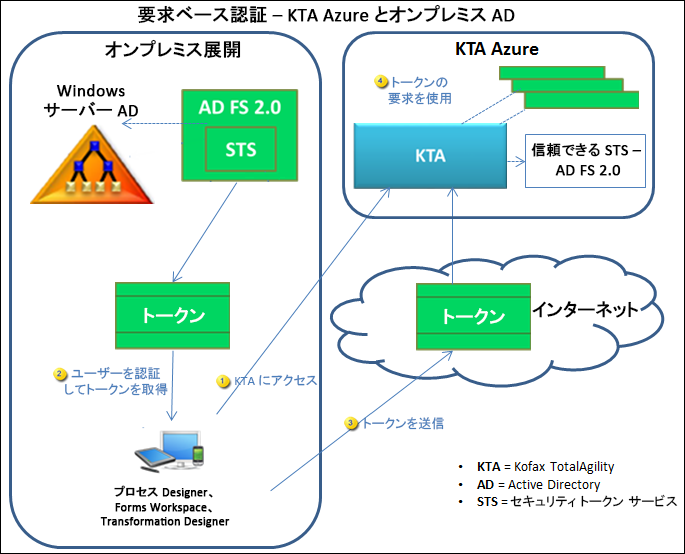 このシナリオでは、オンプレミスの Windows サーバー AD FS 2.0 (ID プロバイダとして) を使用してクラウドにインストールした TotalAgility Azure またはオンプレミスについて説明します。