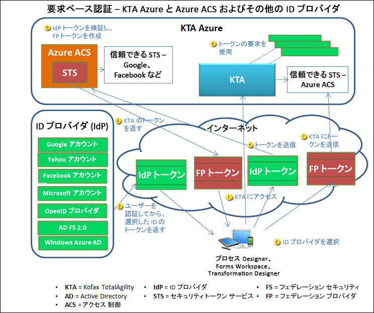 このシナリオでは、Windows Azure AD のアクセス制御 (フェデレーション プロバイダとして) およびその他の ID プロバイダを使用した TotalAgility Azure について説明します。