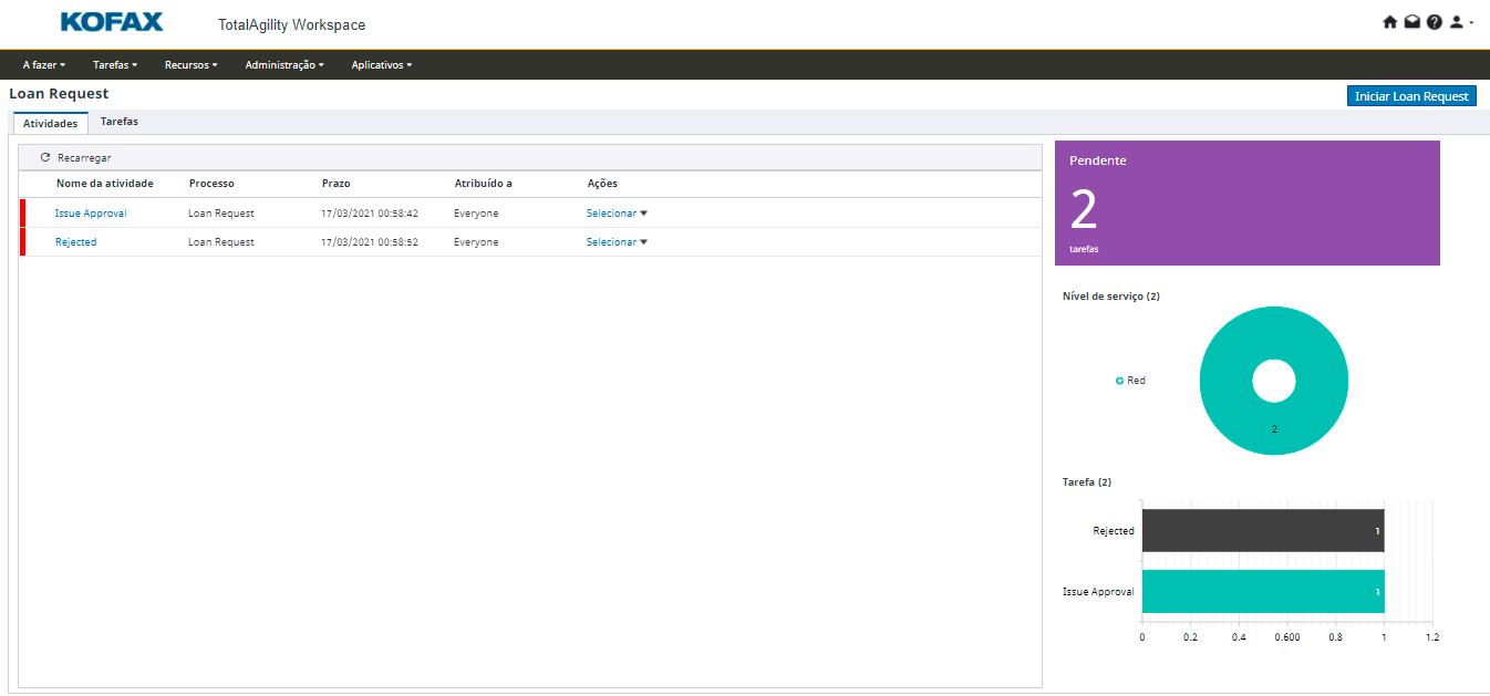 Os aplicativos publicados no Quick Workflow estão disponíveis no Workspace junto com uma página de destino. Essa página oferece um painel a partir do qual você pode criar novas instâncias do seu fluxo de trabalho, realizar e concluir atividades, visualizar propriedades de trabalhos e monitorar estatísticas sobre os trabalhos.