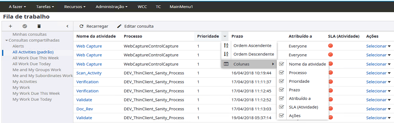 3. Para ocultar colunas, no menu da coluna, como Nome da atividade, por exemplo, pause o cursor do mouse sobre Colunas e limpe a caixa de seleção da coluna a ser ocultada.