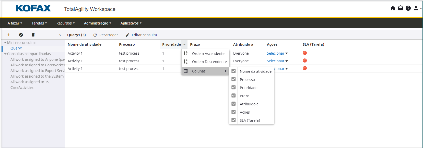 3. Para ocultar colunas, no menu da coluna, como Nome da atividade, por exemplo, pause o cursor do mouse sobre Colunas e limpe a caixa de seleção da coluna a ser ocultada.
