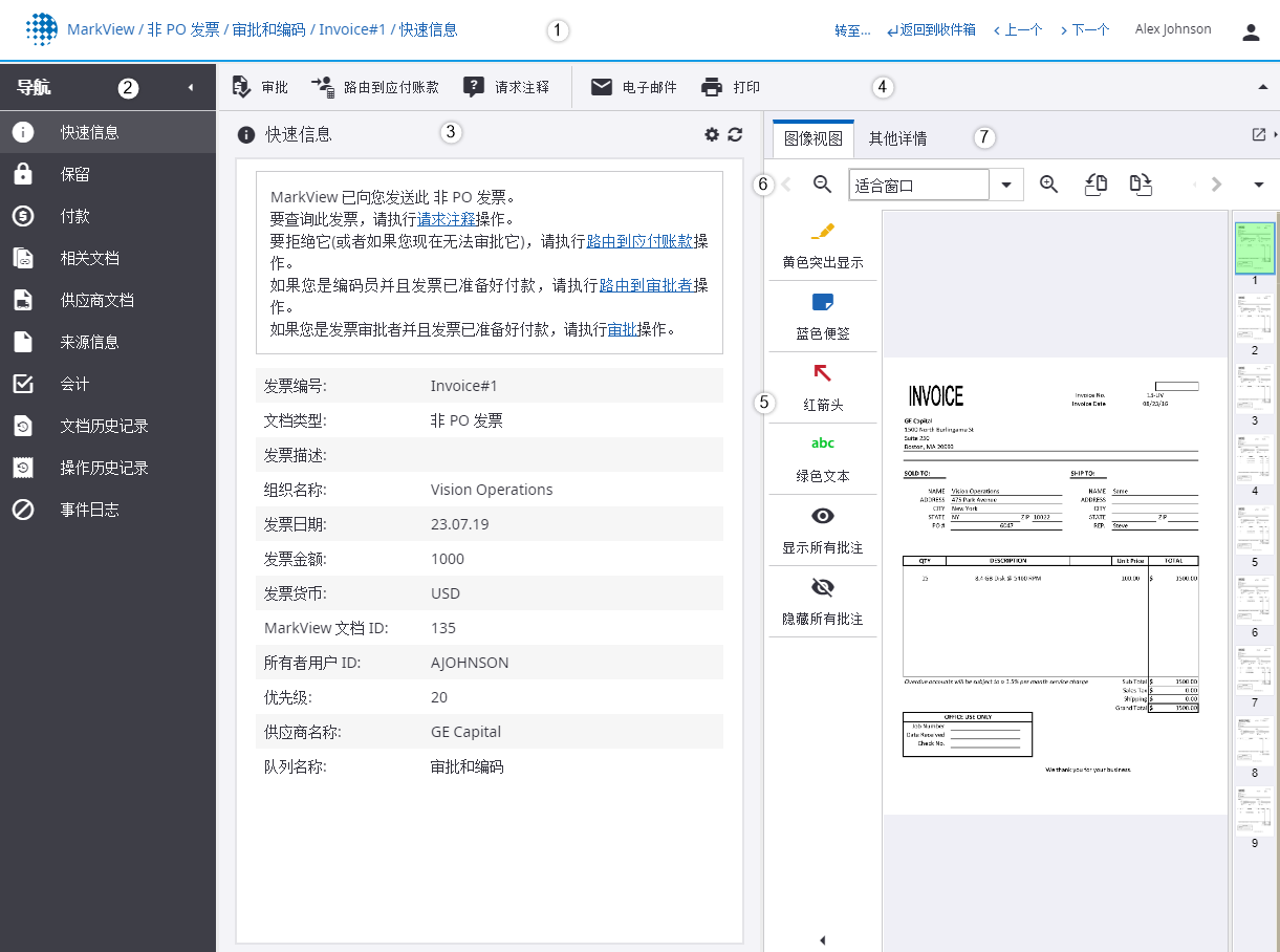 常规概览 标头 导航窗格 详情部分 操作工具栏 批注工具栏 图像操作工具栏 图像视图和其他详细信息 如何... 处理文档?请查看执行操作。 向文档中添加信息?请查看添加批注。 更改我的文档视图?请查看图像操作工具栏。 更改查看器的外观?请查看设置。 手动输入文档行和分发?请查看会计。 在哪里查找... 有关当前队列的信息? 系统消息? 文档详情?