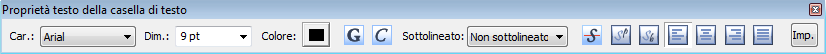 Utilizzare lo strumento Mano o lo strumento Casella di testo per selezionare del testo esistente, quindi fare doppio clic per modificarlo. Per modificare le proprietà del testo, selezionare tutto o parte del testo, fare clic con il pulsante destro del mouse e selezionare Proprietà; viene visualizzata la barra degli strumenti riportata di seguito: