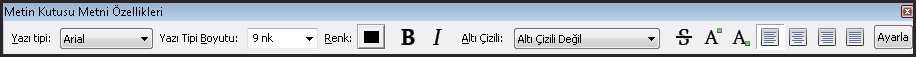 Gerekiyorsa, daha uzun metinler girilebilecek şekilde kutu genişletilir. Metin girerken seçim yapın, kutuyu sağ tıklatın ve aşağıda gösterilen araç çubuğundaki seçimin metin özelliklerini değiştirmek için kısayol menüsünde Özellikler'i tıklatın.