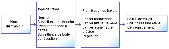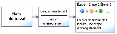 Un flux de travail (à l'exception des flux de travail invoqués par des codes à barres) ne contient pas nécessairement d'étape d'enregistrement. Un travail en contient obligatoirement une au minimum.