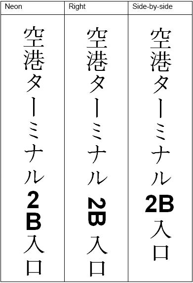 Texts embedded in vertical texts can have three orientations: vertical (neon), right-rotated and side-by-side. The latter is usually limited to three characters, and is most often used for Arabic numerals. The output converters of RecAPIPlus transform all such embedded texts to the right rotation.