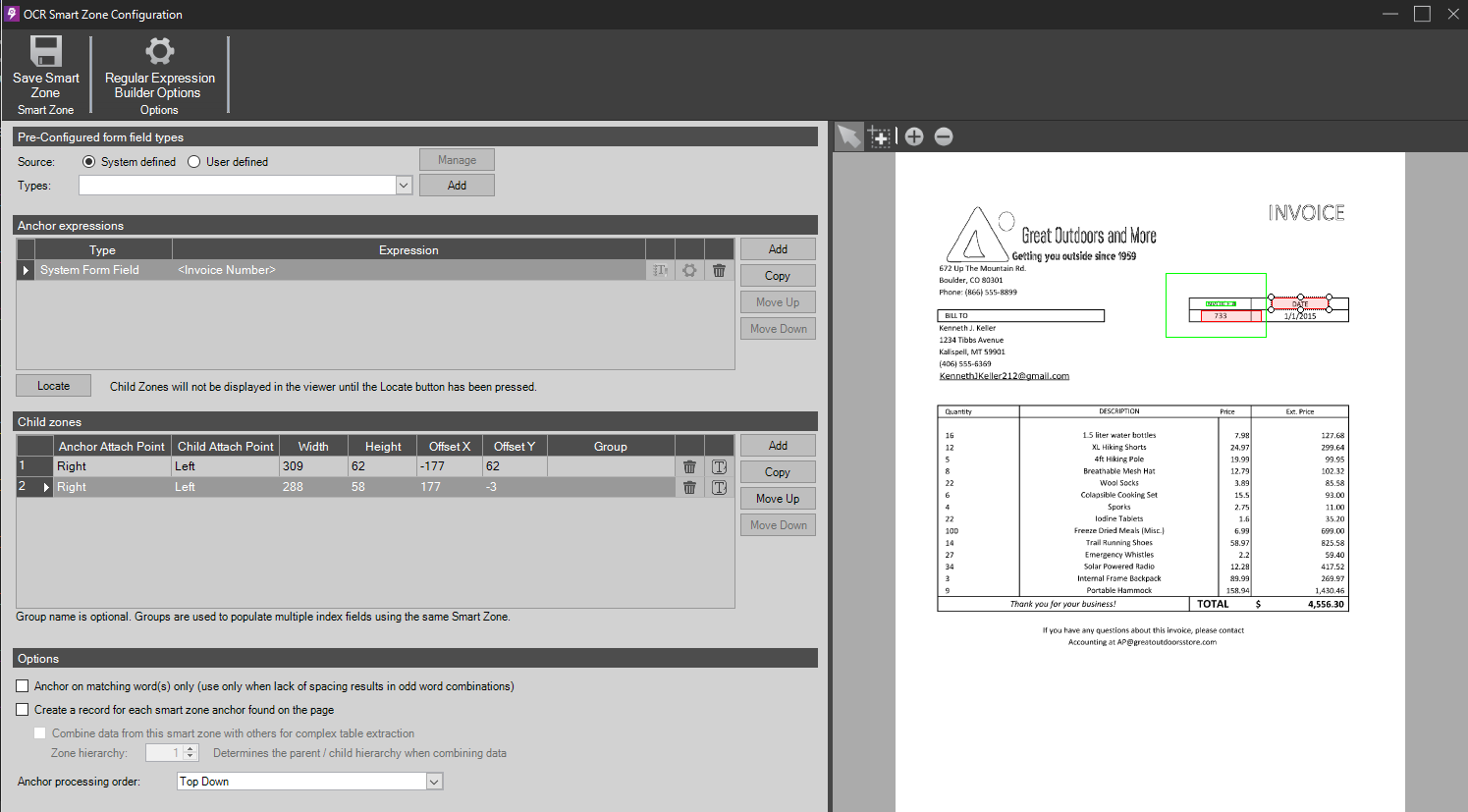 In the example below, we have one anchor that looks for the text "Invoice". This anchor has four child zones. From this single anchor, we can locate and capture the invoice number, invoice date, company, and phone number.