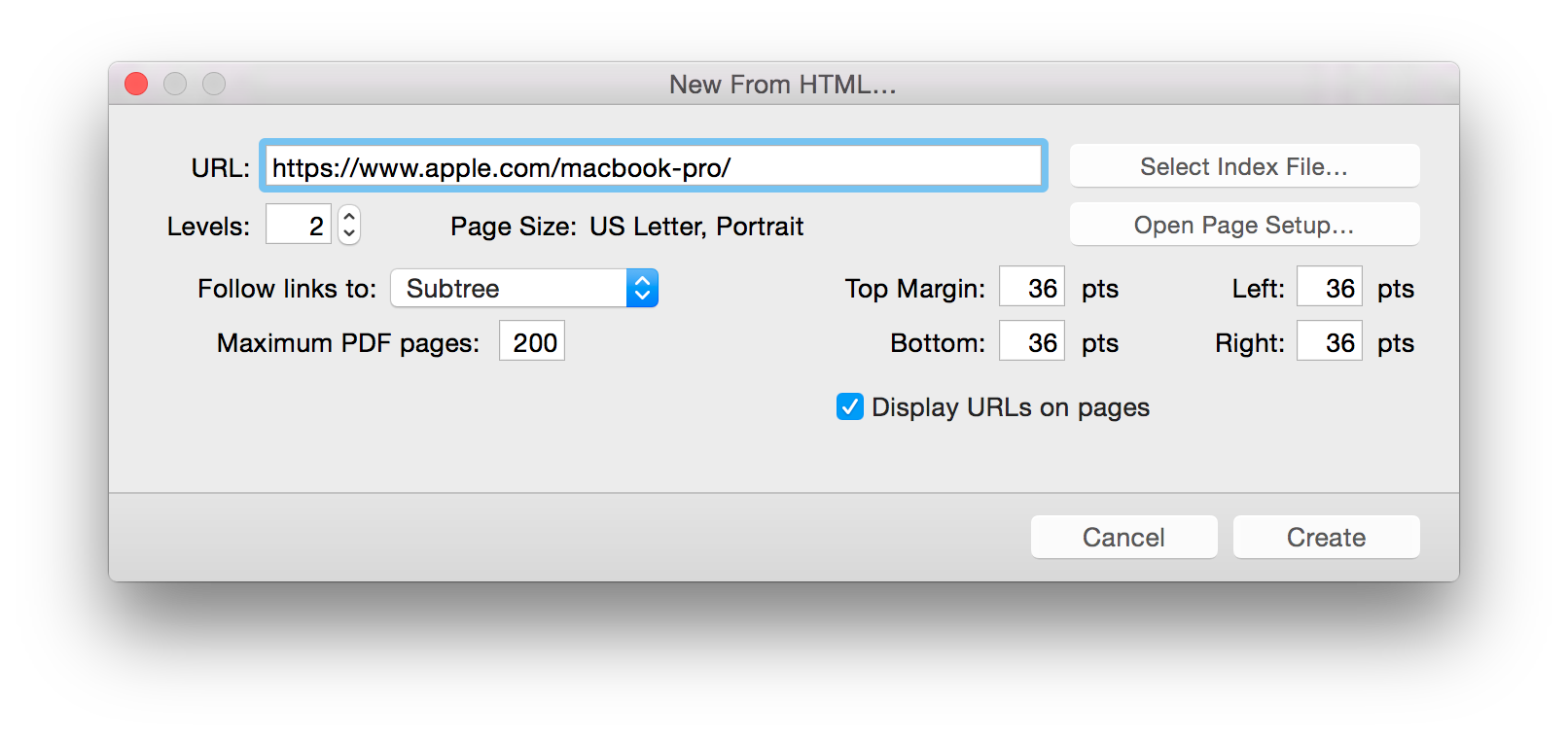 Folge den Links zu: Es gibt drei Optionen. Angenommen, Sie wollten ein PDF der URL http://www.apple.com/macbookair/index erstellen, würden Sie die Optionen wie unten beschrieben verwenden.