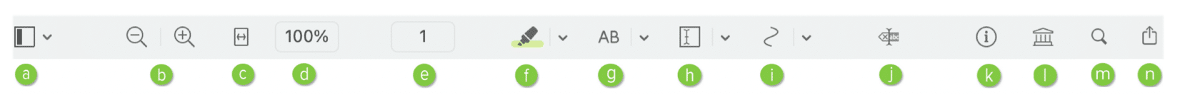 Visible por defecto, oculta y revela la barra de herramientas seleccionando Ver > Ocultar barra de herramientas (Comando+Mayúsculas+B). Kofax Power PDF for Mac proporciona un conjunto de elementos de la barra de herramientas por defecto.