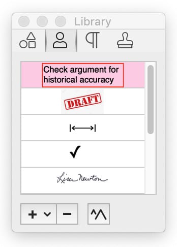 Stockez les objets pour une utilisation ultérieure, y compris les objets créés avec l'outil de Trait libre, les objets de l'outil de Dessin (polygones, lignes), les objets de l'outil d'annotation (zones de texte, commentaires) ou les images (photos, signatures).