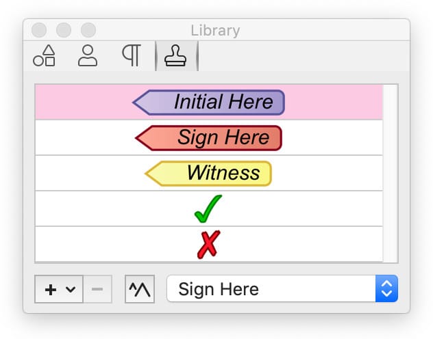 Faites glisser les tampons dans votre document. Choisissez parmi les options suivantes : Norme Professionnelle, Signez Ici, Tampons Dynamiques ou Utilisateur Défini. Le nom dans un tampon dynamique est défini dans les préférences d'édition.