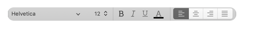 In alternativa, il carattere, la dimensione e lo stile sono accessibili scegliendo Formato > Carattere > Mostra caratteri (Comando+T). La giustificazione è accessibile scegliendo Formato > Testo.