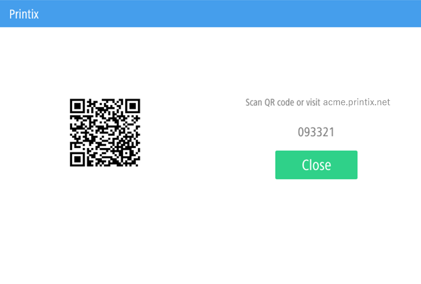 Výběrem možnosti Zapomenutý kód otevřete novou obrazovku s kódem QR. Pomocí fotoaparátu telefonu nebo tabletu naskenujte kód QR a otevřete možnost Karty a kódy v aplikaci Printix App, nebo přejděte na uvedenou adresu URL a obnovte si kód PIN.