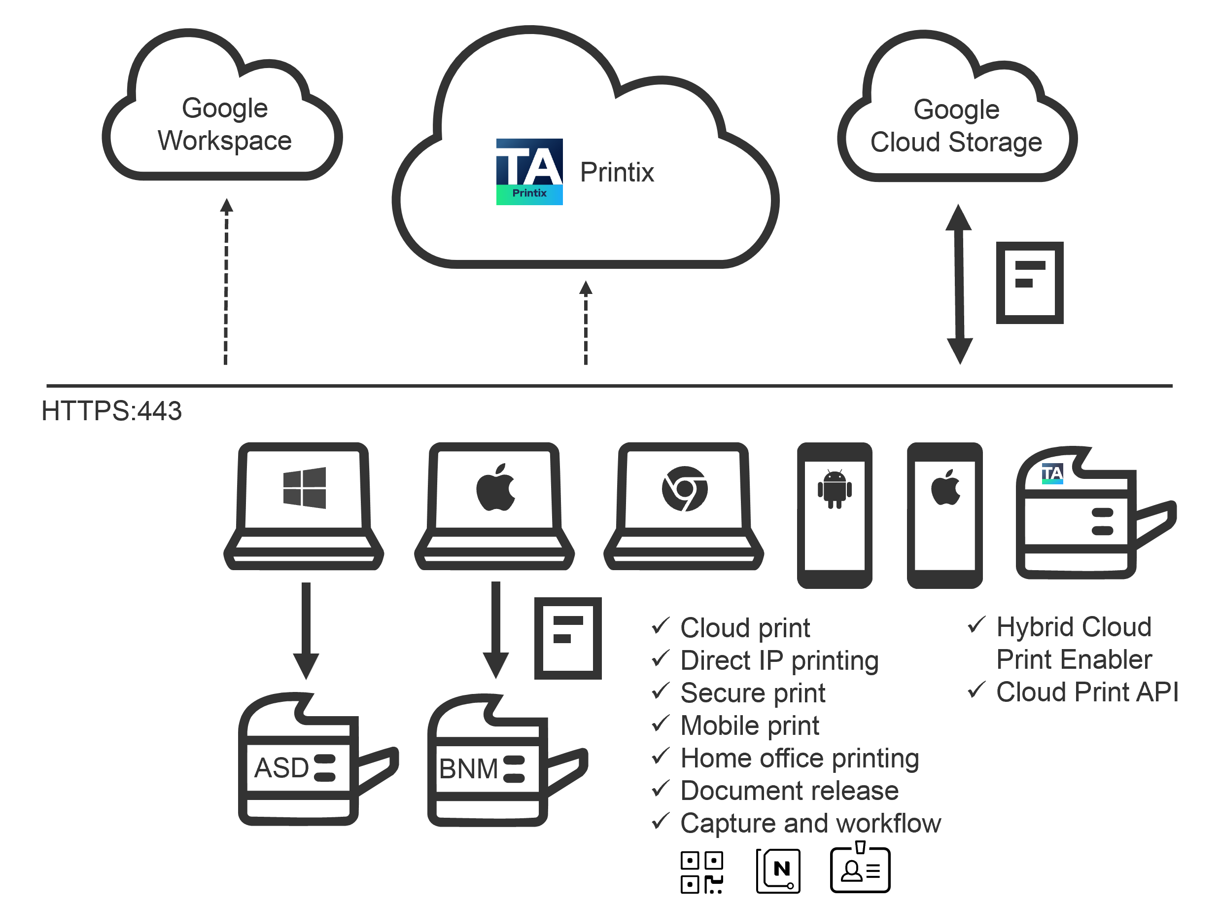 The Printix App is available as an app for Android and iOS/iPadOS phones and tablets, and as a web app that runs in a web browser on your phone, tablet, and computer.