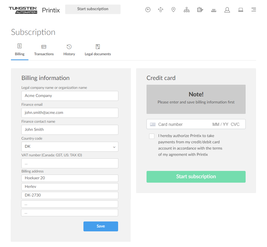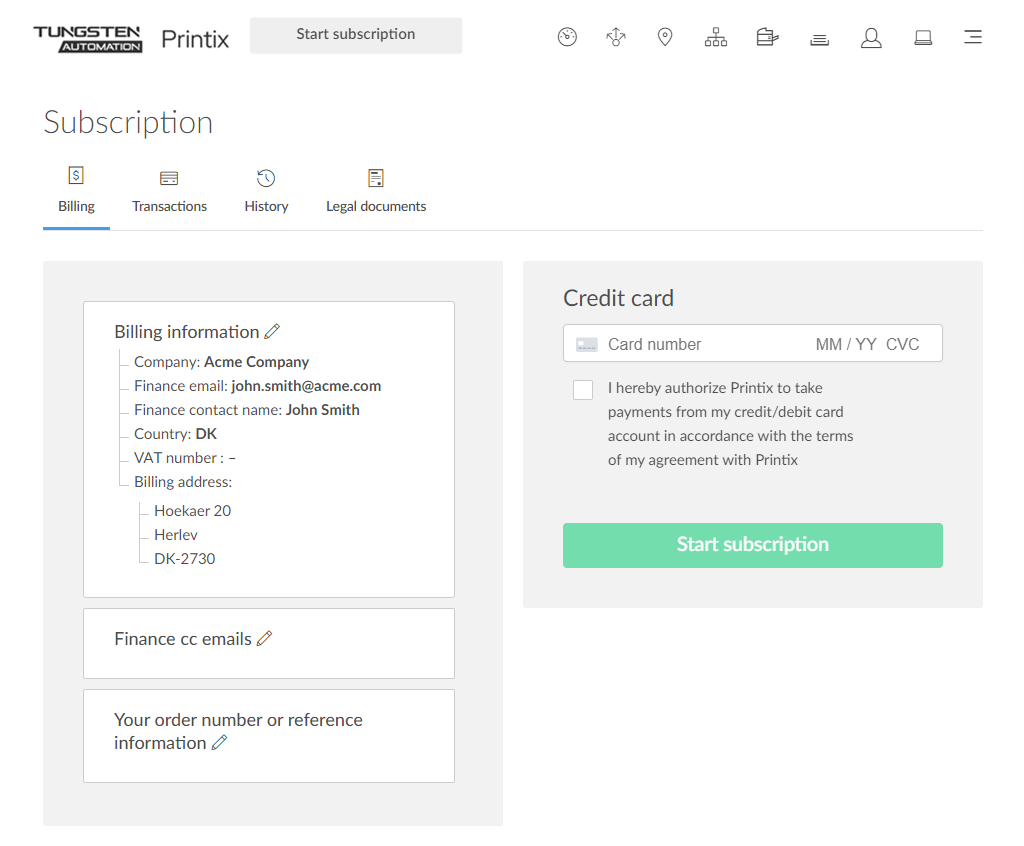 You can pay by credit card, or contact Product Support to enquire about an invoicing option/annual payment by credit card or bank transfer (no cheques). If your Printix Home was created by a Printix partner, the payment is handled through the partner, and the Billing and Transaction tabs are not present.