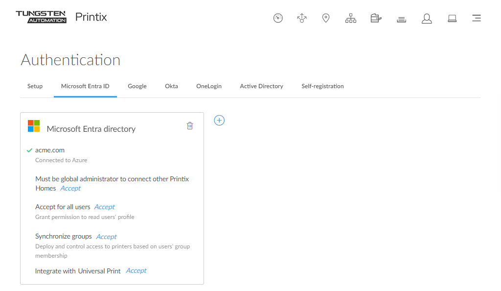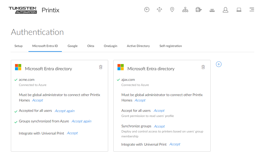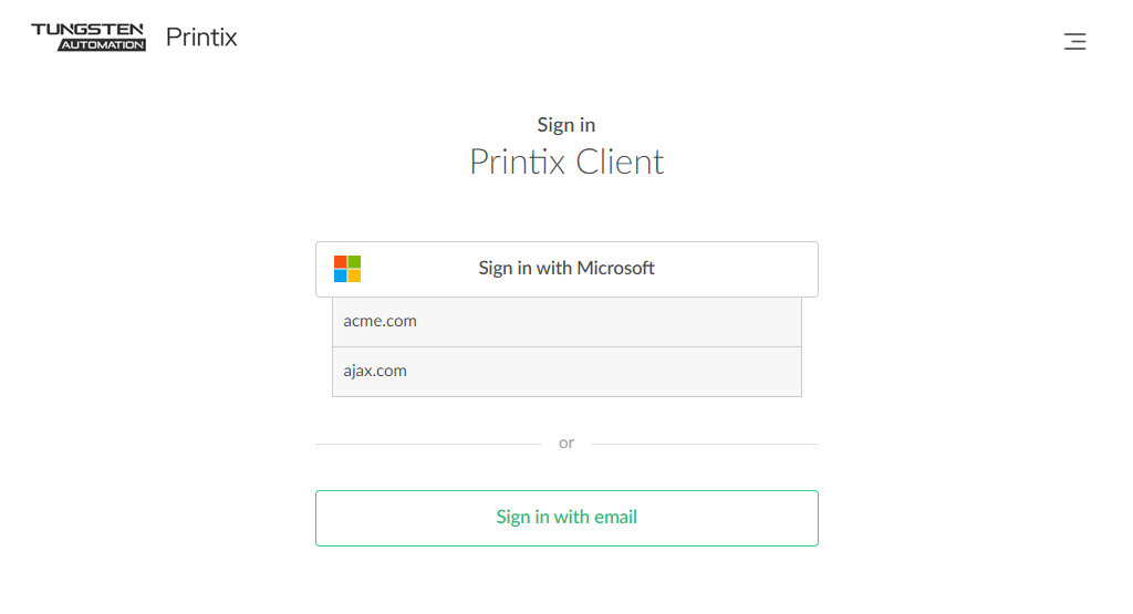 If more than one Microsoft Entra directories exist, sign-in to Printix Client is no longer automatic the first time on Microsoft Entra joined Windows 10 and 11 computers. The user must select a directory (acme.com or ajax.com) and then sign in, but only the first time.