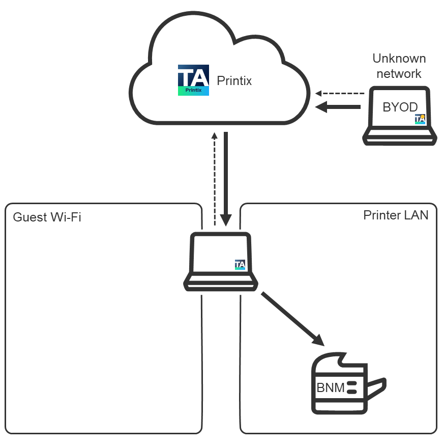 • A company computer with Printix Client is powered on at all times and has two network interfaces (Wi-Fi and LAN).