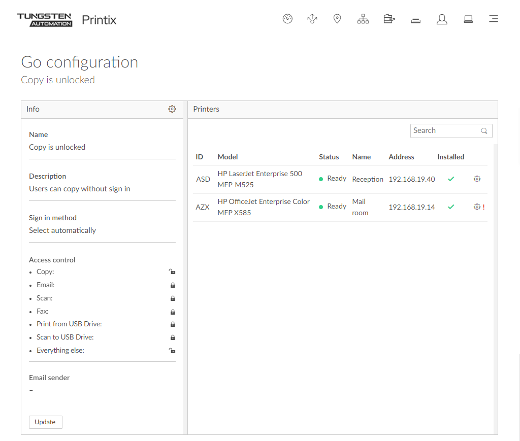 For Ricoh printers, consider making separate configurations, so in the future, when you want to update the Printix Go Ricoh software, this can be done in stages, yet efficiently. This is because the Ricoh printer will restart twice and this takes 10–25 minutes, and during this period, the printer is unavailable to users.