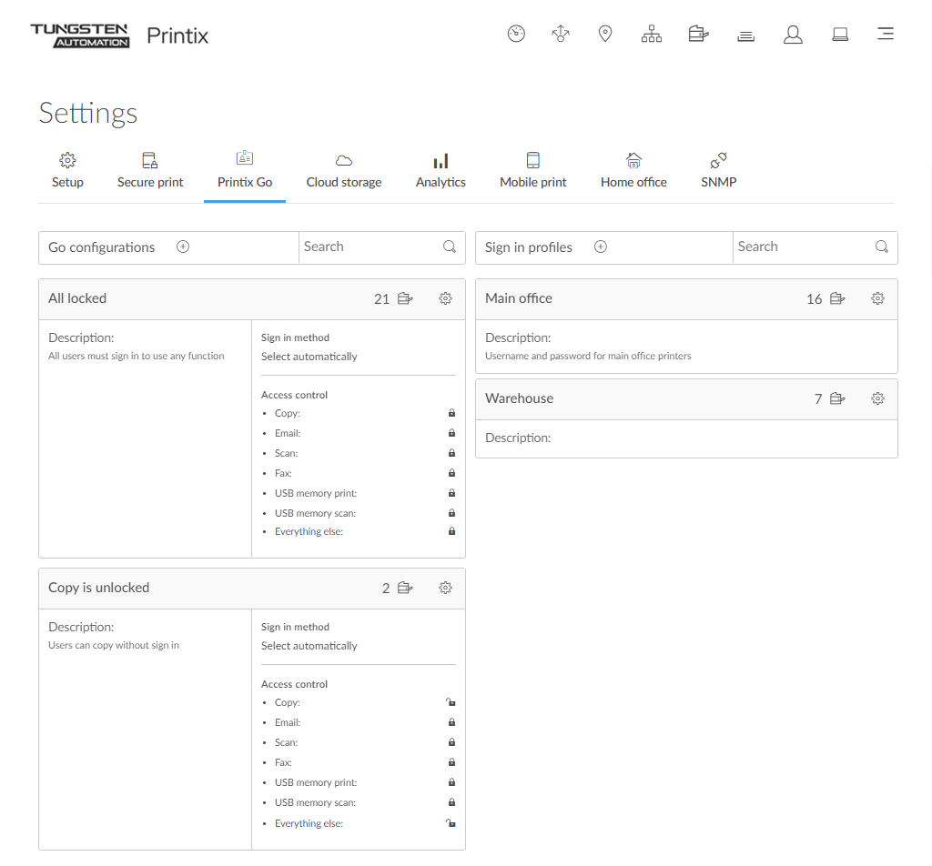 Select a Go configuration name to open the Go configuration page to see the printers that use the Go configuration.