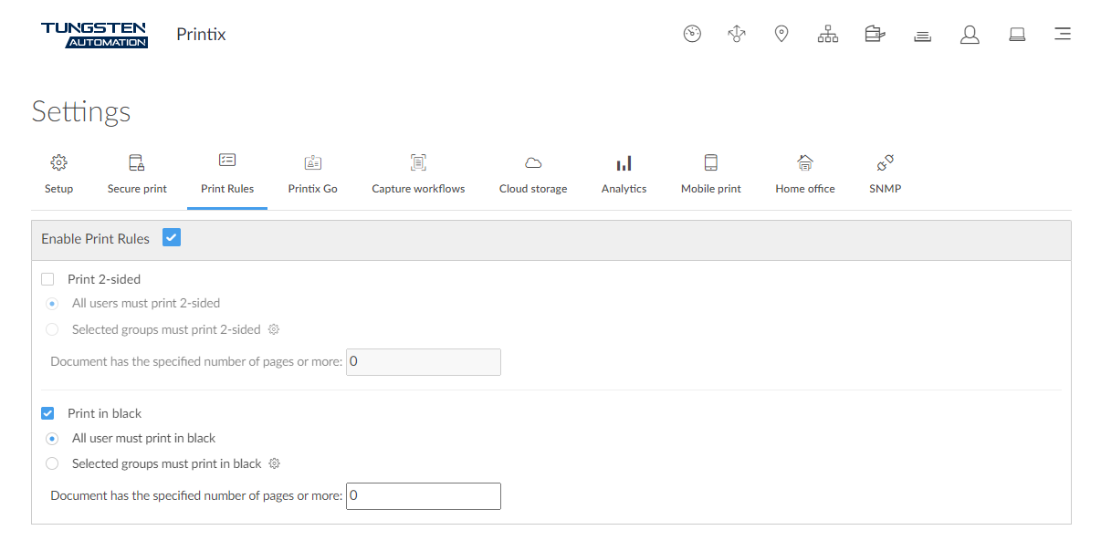 - Optionally, you can configure print rules to only affect documents that exceed a specific number of pages.