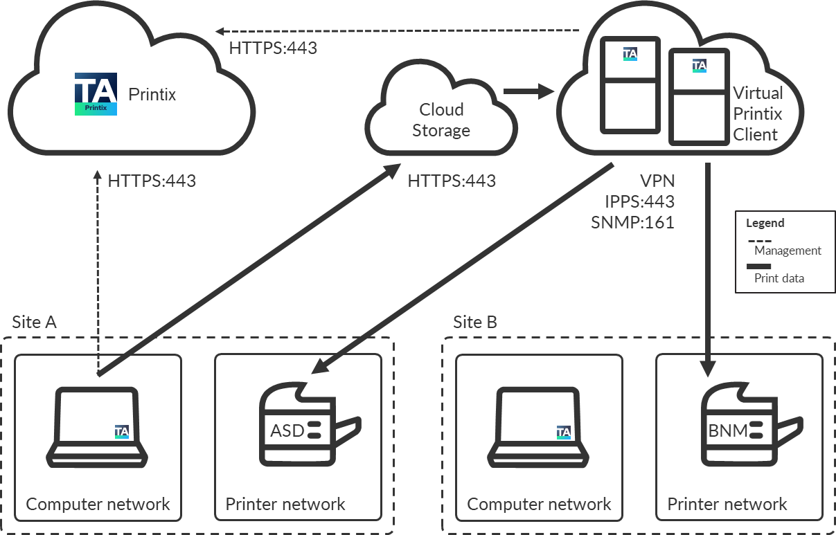 The Printix Client is installed on the computer and the computer can route (via VPN) to the printers on the printers' networks. By adding the computer to the printers' network, Printix can print on those printers, even though no physical computer is connected on the printer network. If you are concerned about resilience, you can add additional computers in the cloud.
