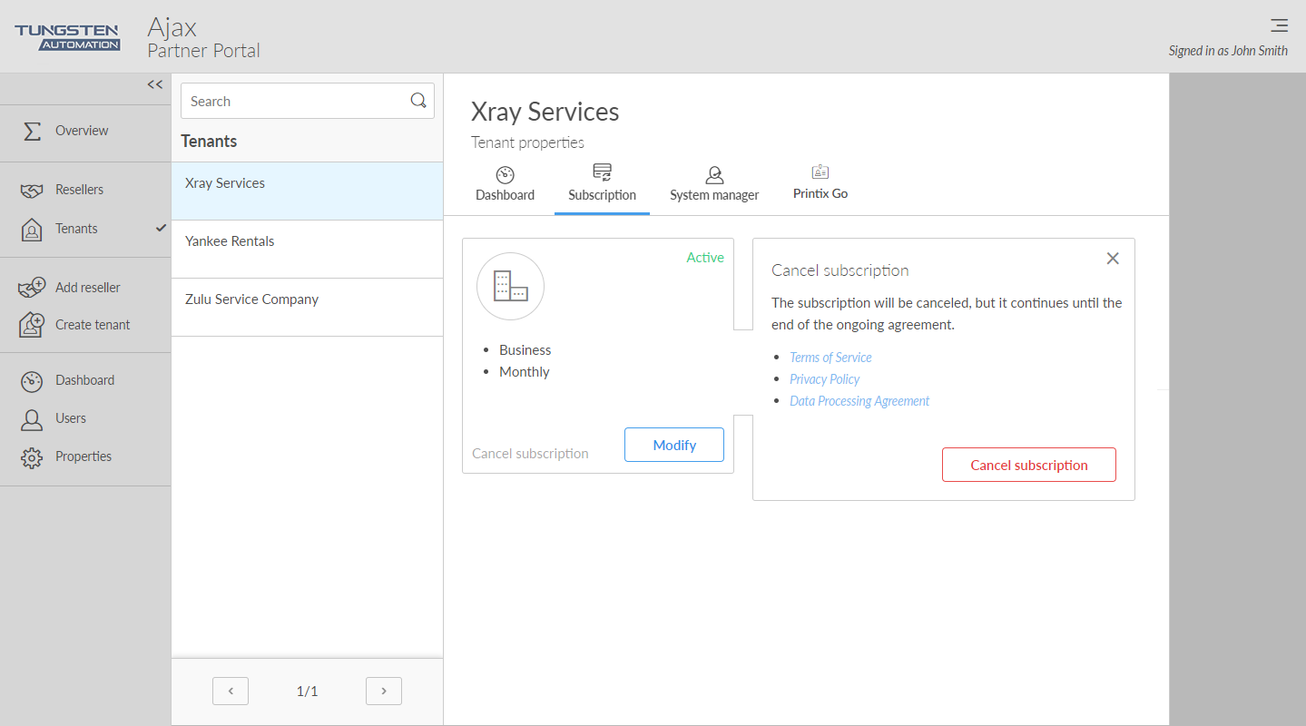 Cancellation is effective at the end of the year for which you have paid. Contact finance.printix@tungstenautomation.com.