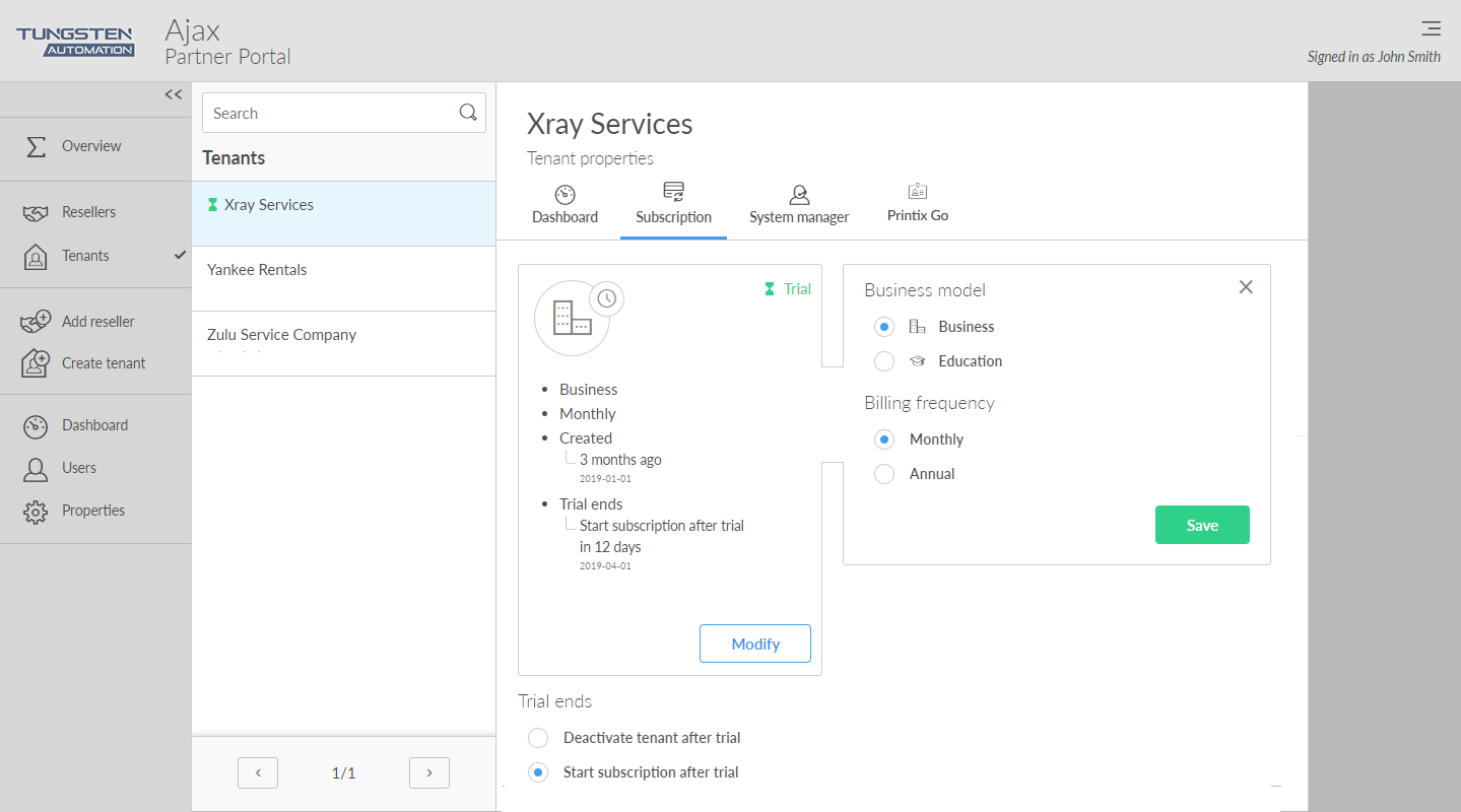 Monthly is the default setting and the tenant will be added as a line item to the partner's monthly aggregated invoice.