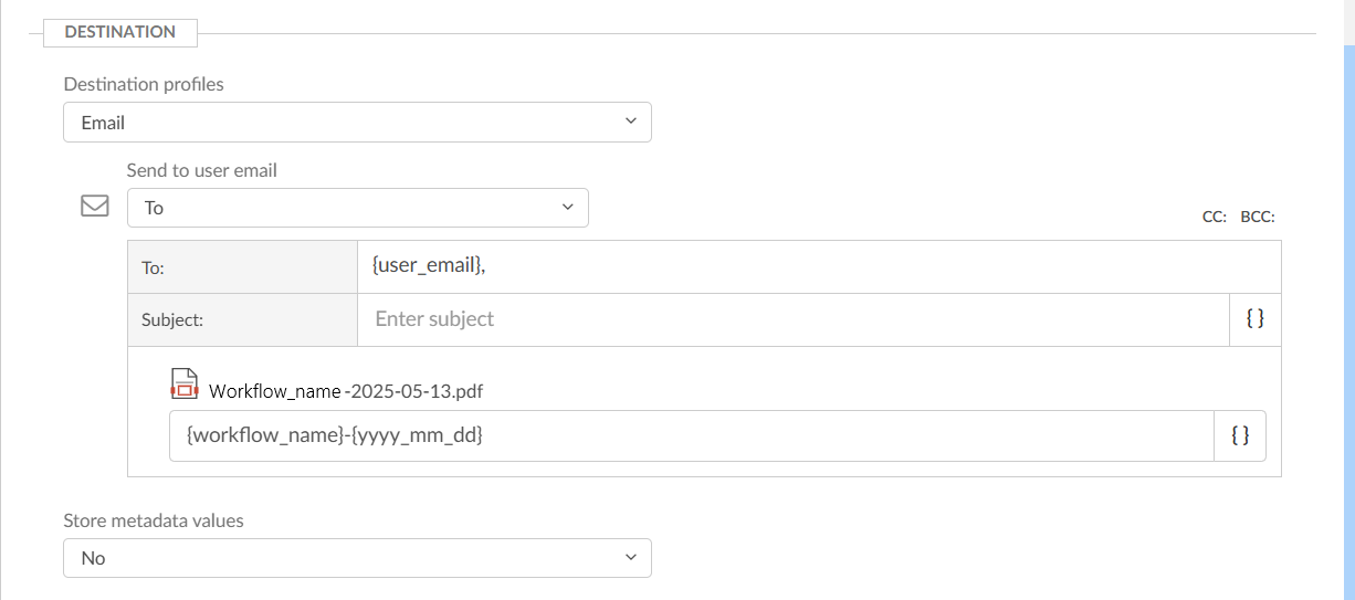 In Subject, enter an optional subject. You can select the braces { } to insert variables, such as Workflow name.