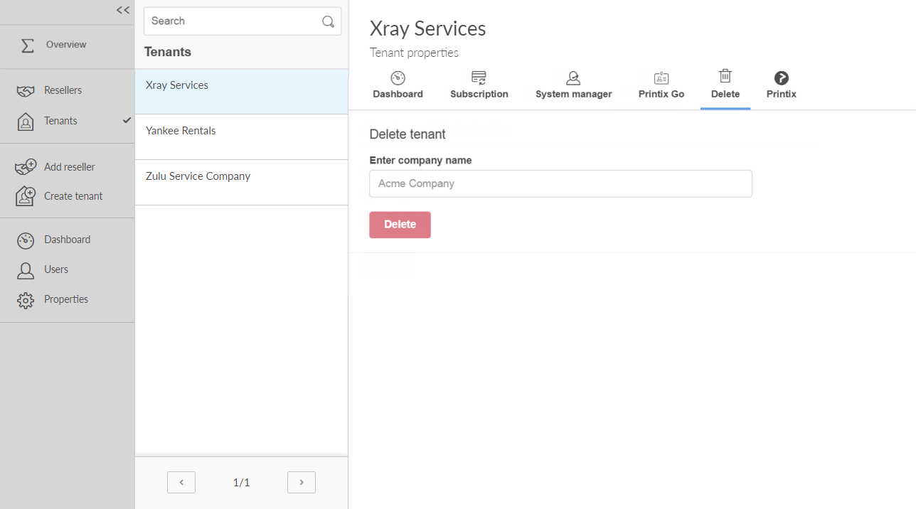 Use the Delete tab to permanently remove a tenant from the Printix Partner Portal. Deleting a tenant is permanent and cannot be reversed.